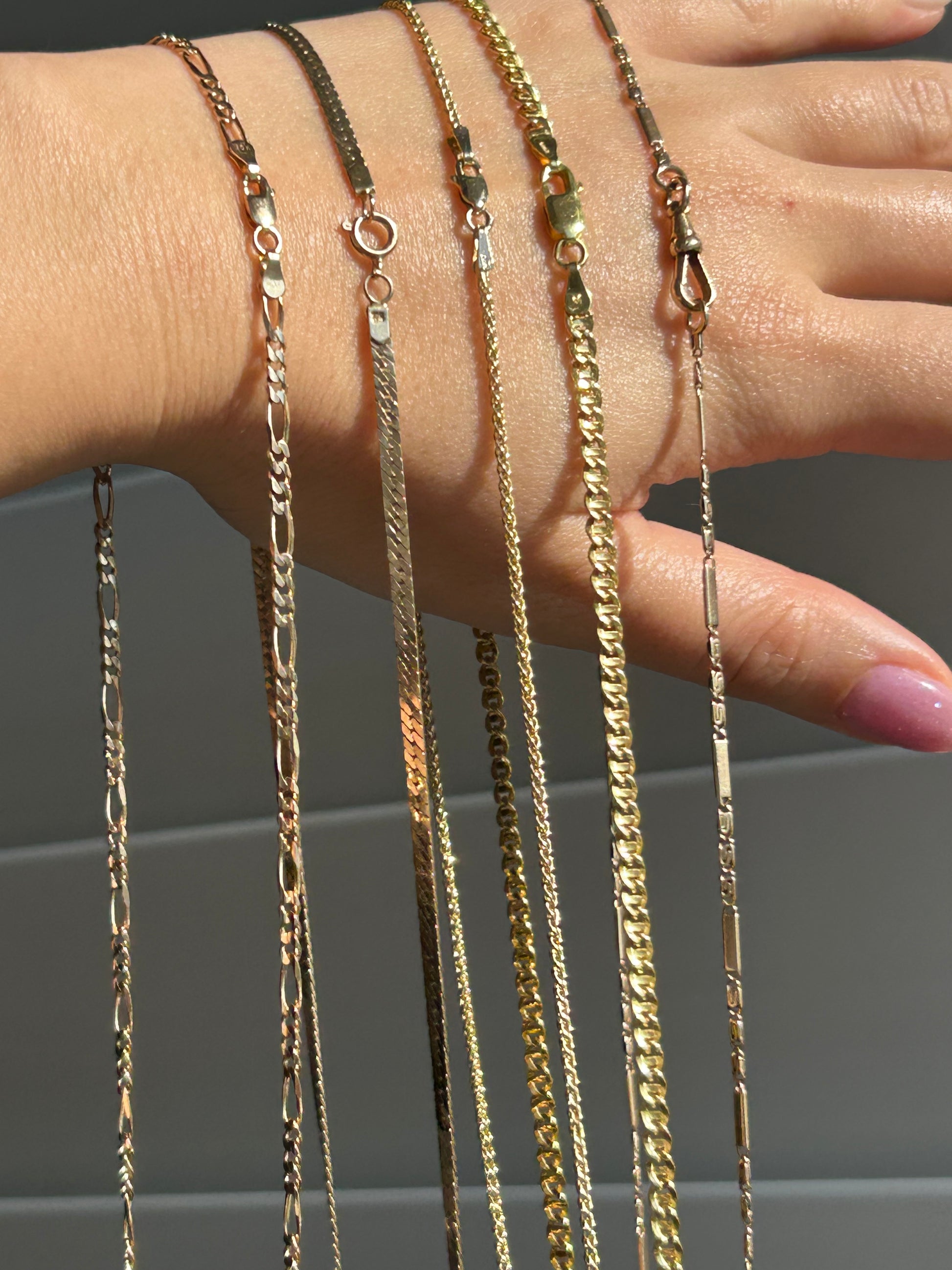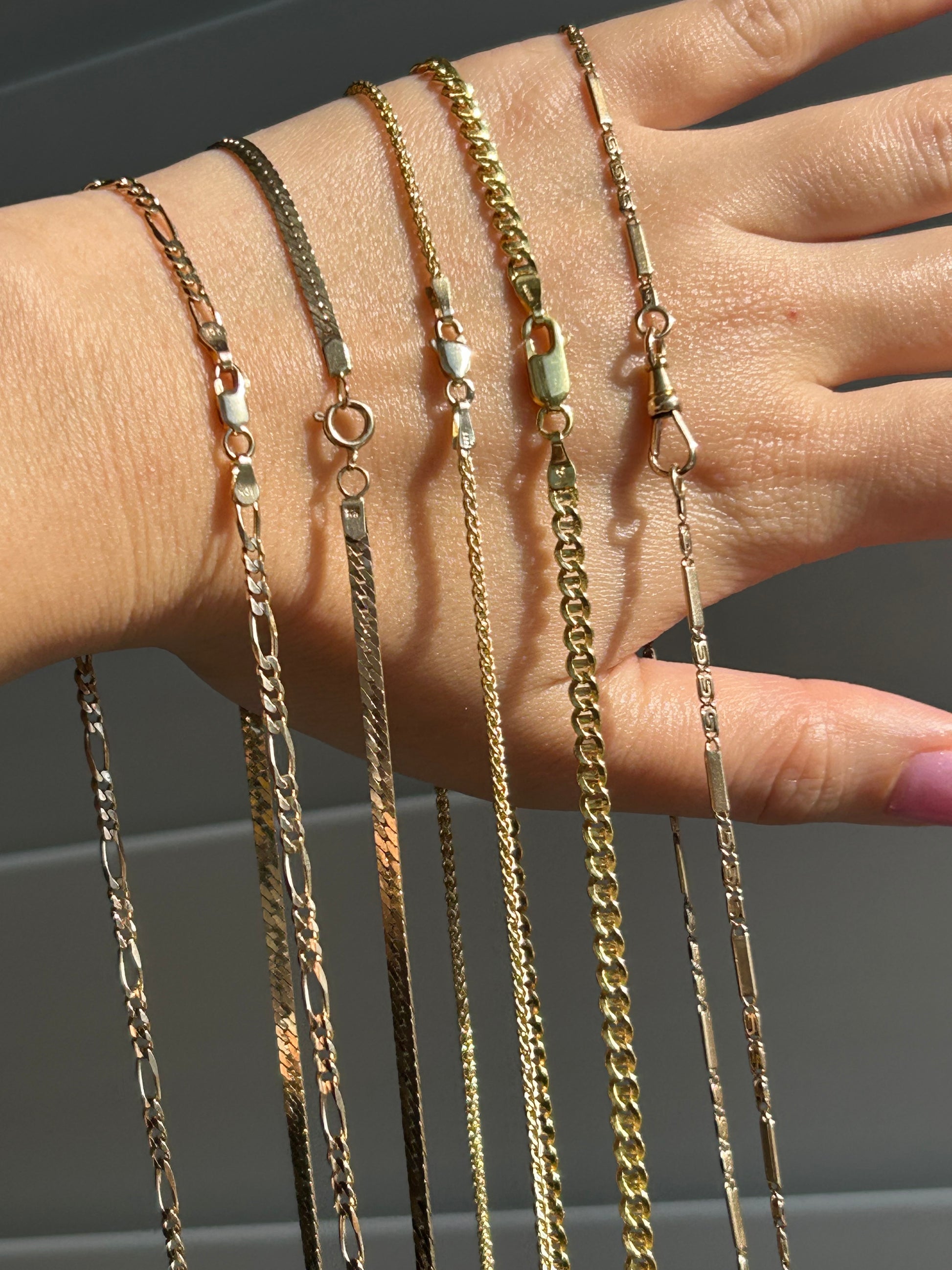 Antique 14k rosy yellow gold. 21”. 8.4g. 2.3 mm. Comes with original working dog clip. Perfect as a base chain for a charm jumble. The styling options are endless.