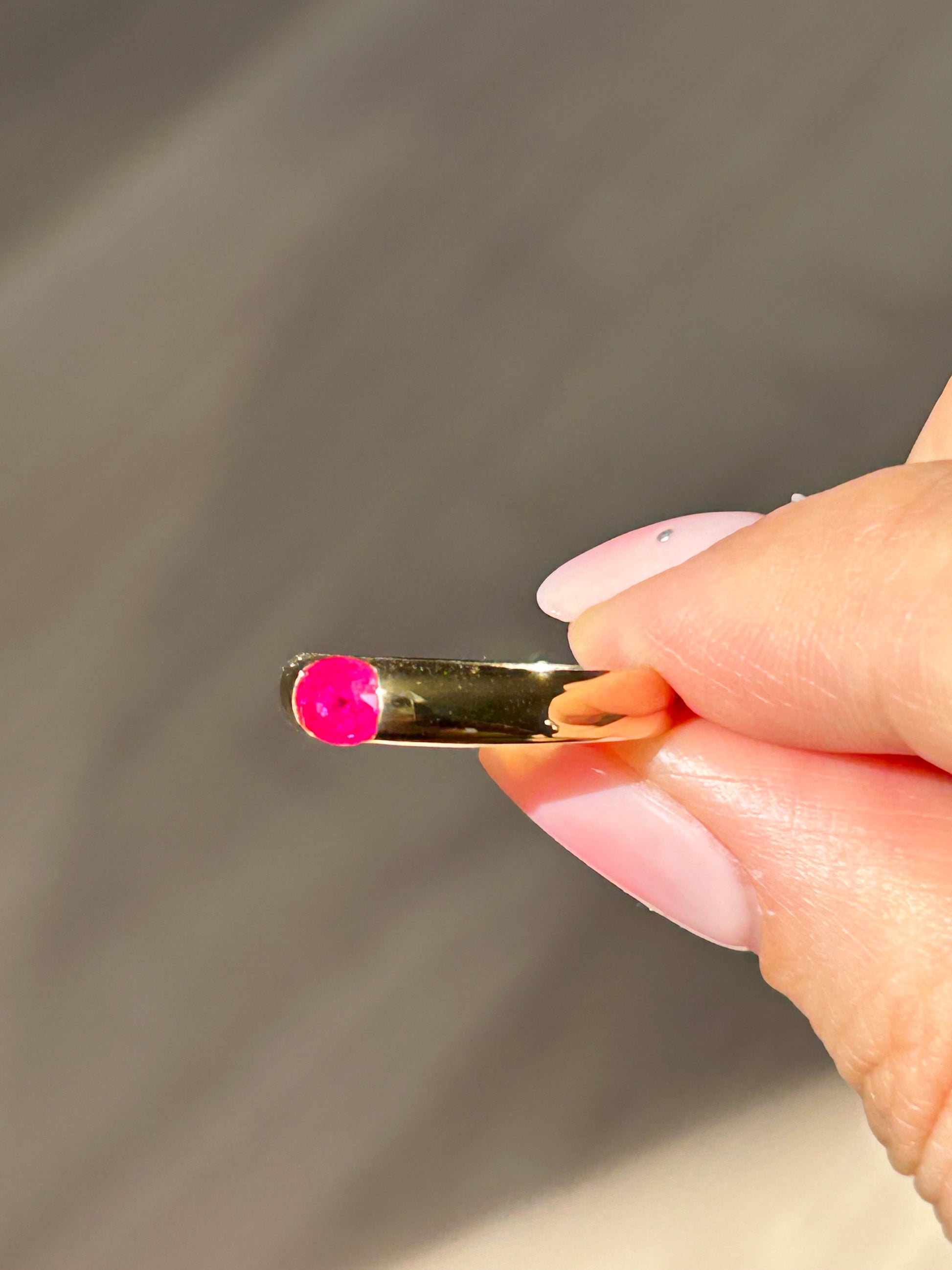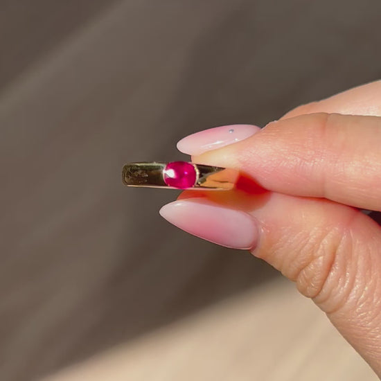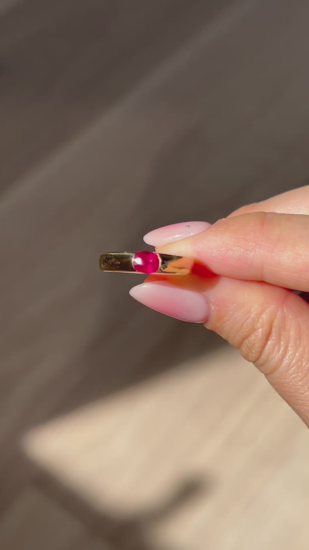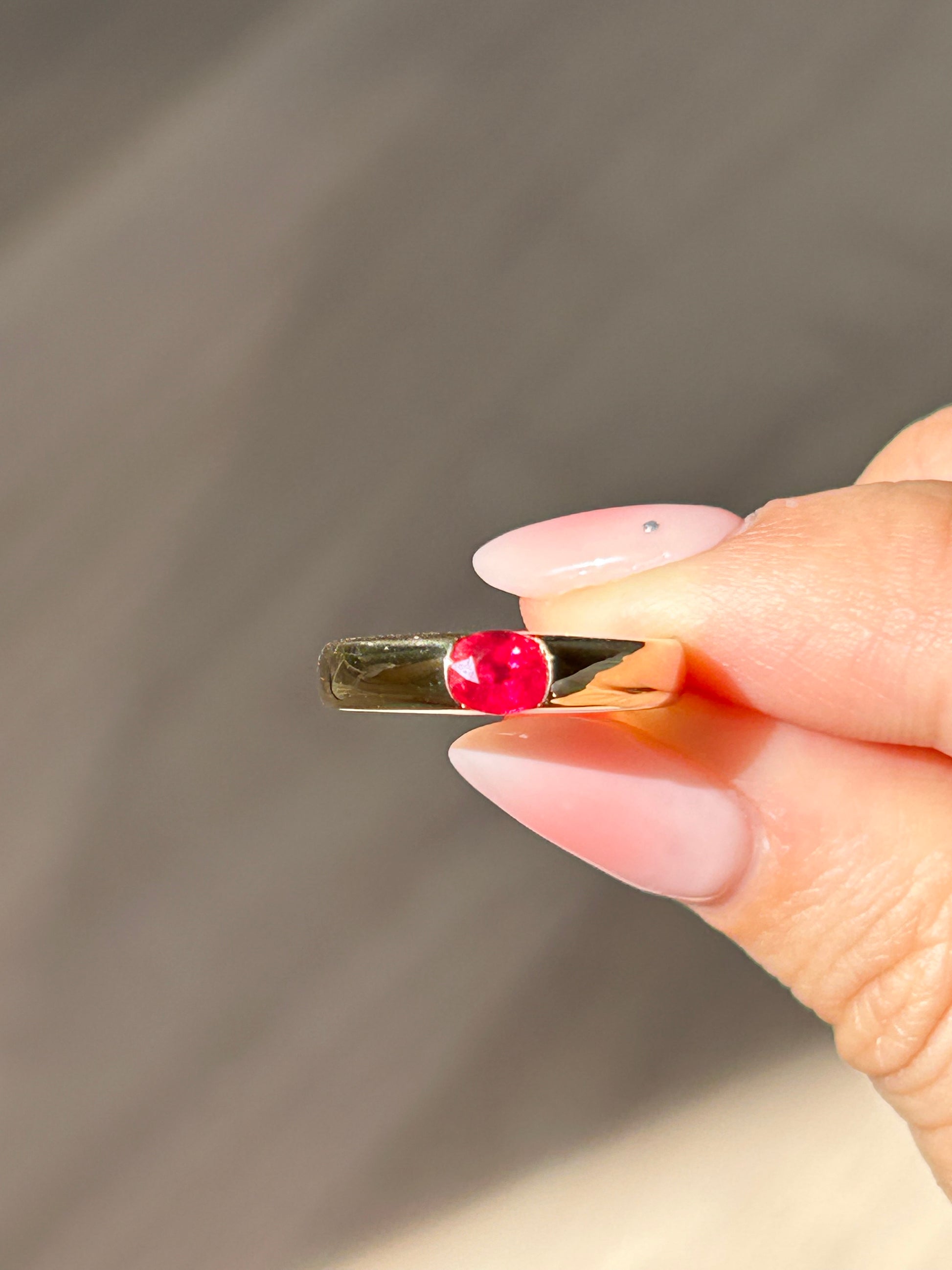 Simple classic vintage ruby ring. The ruby has a stunning raspberry red color and luster set in solid 18k gold with solid back. So easy to wear and to stack.