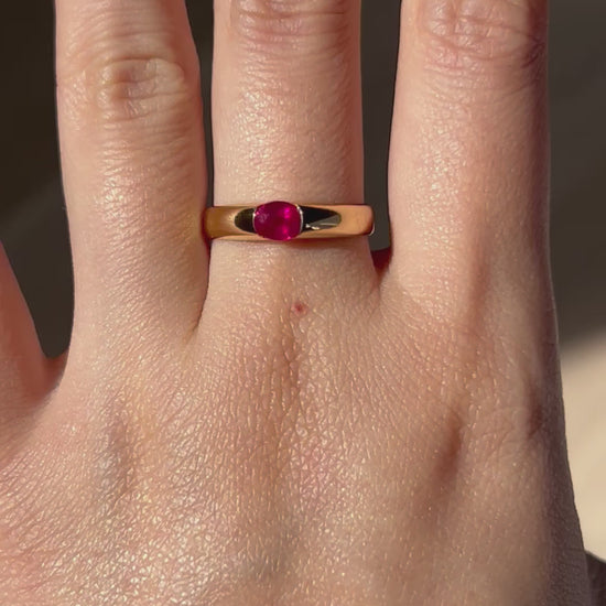 Vintage 18k East West Oval Ruby Half Bezel Set Ring: US Size 7