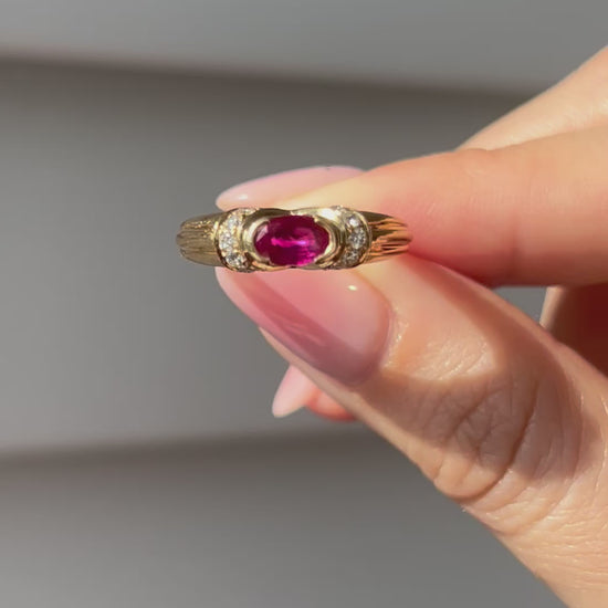 Unique vintage ruby and diamond ring. The ruby has a stunning raspberry red color with amazing luster and clarity