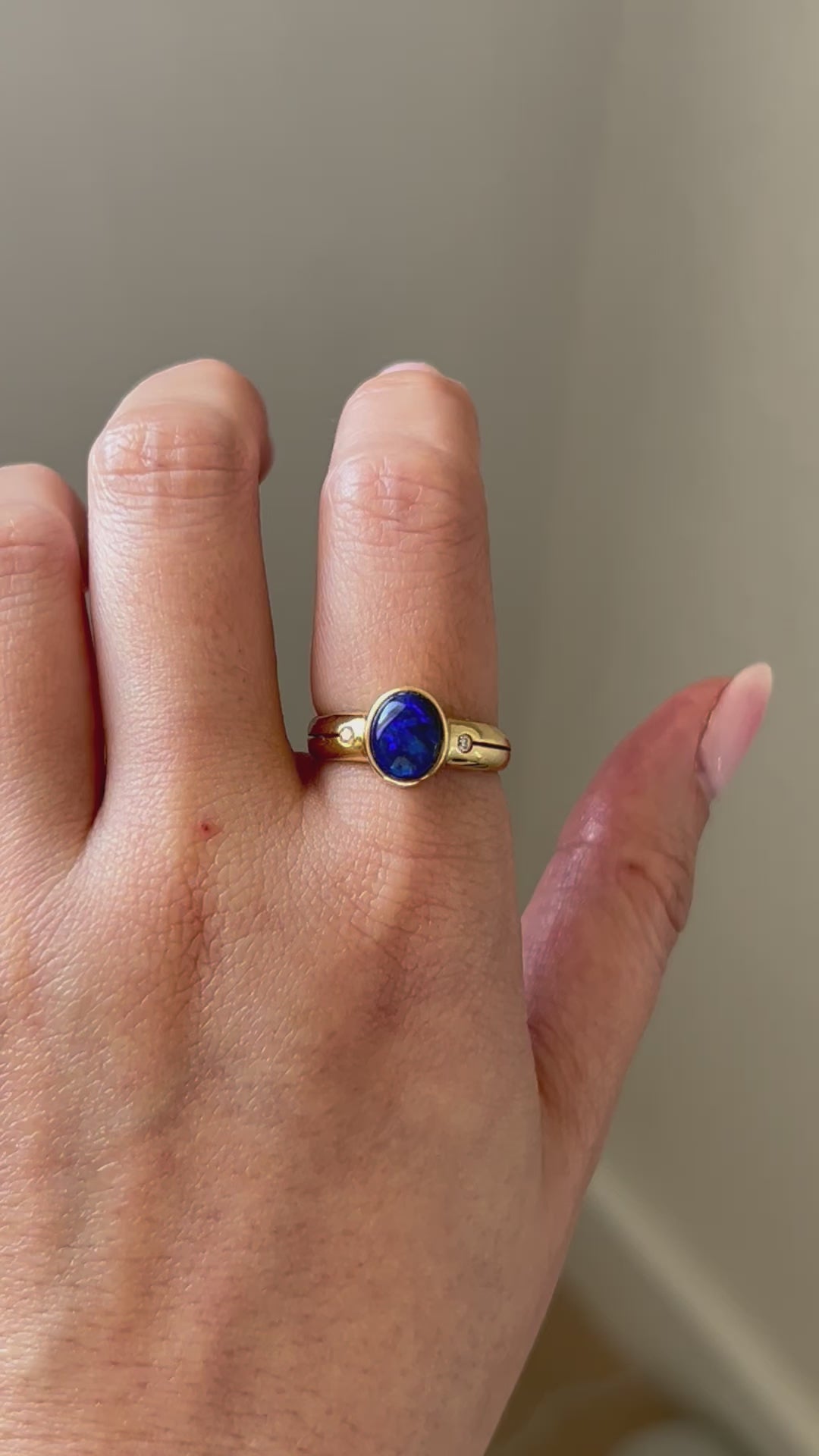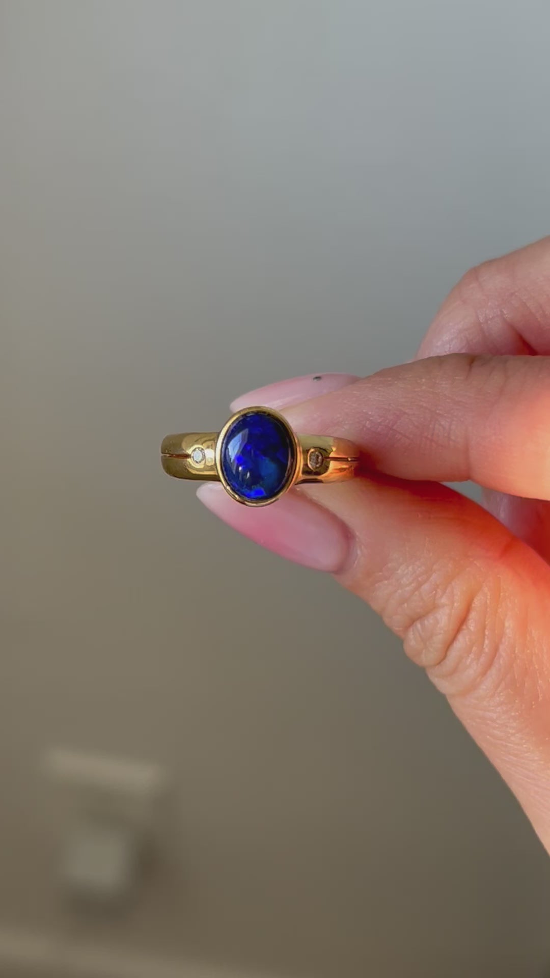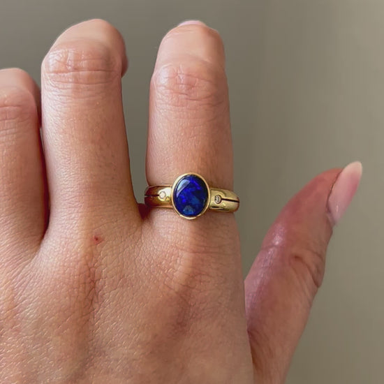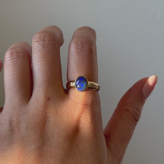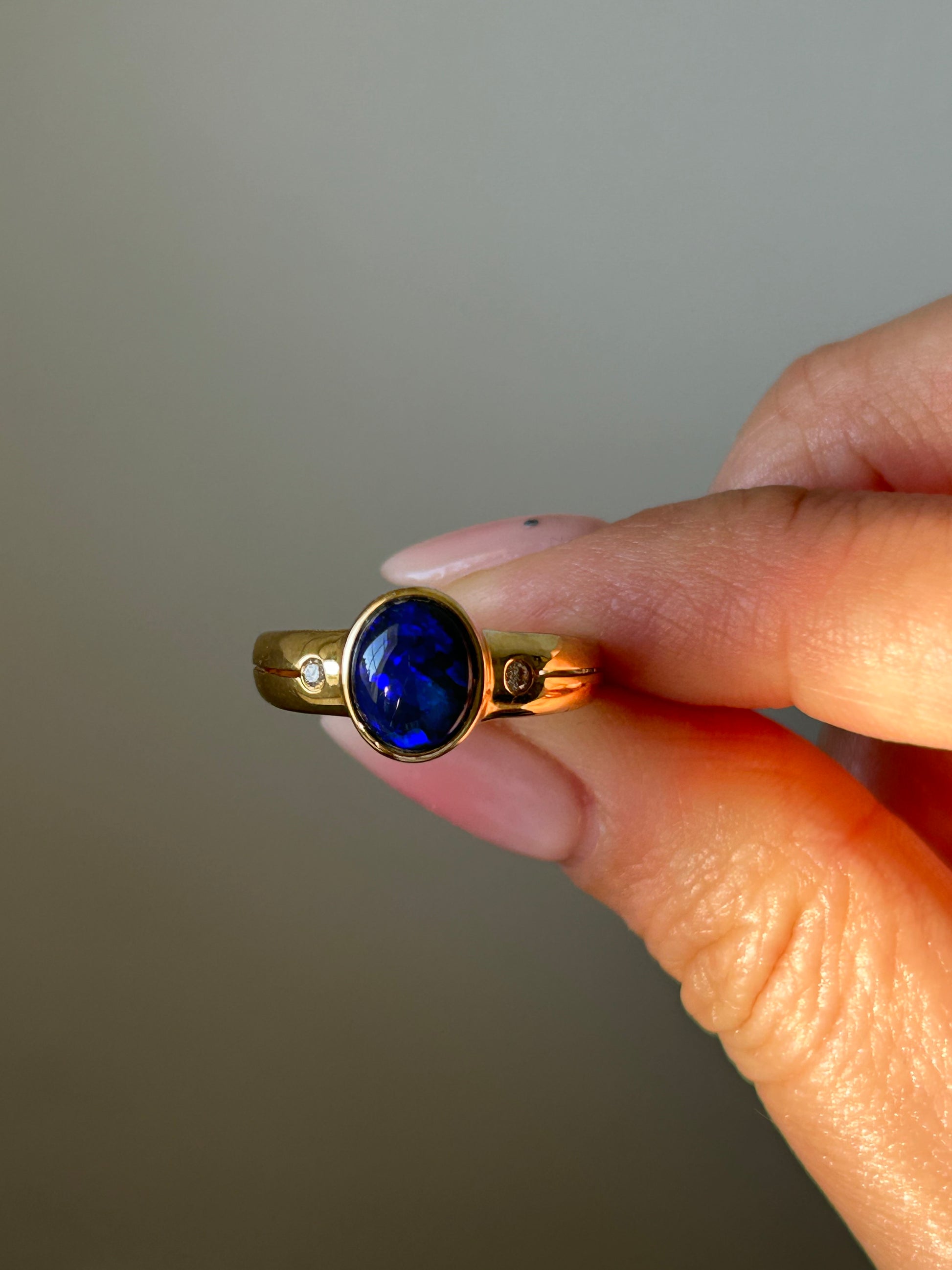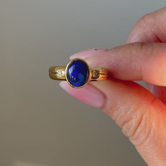 A mesmerizing vintage black and blue opal cabochon in bezel setting with side diamonds and slits along the shoulders. 18k yellow gold. 4g. Size 6.5, resizable. Opal is 1.46 ct.