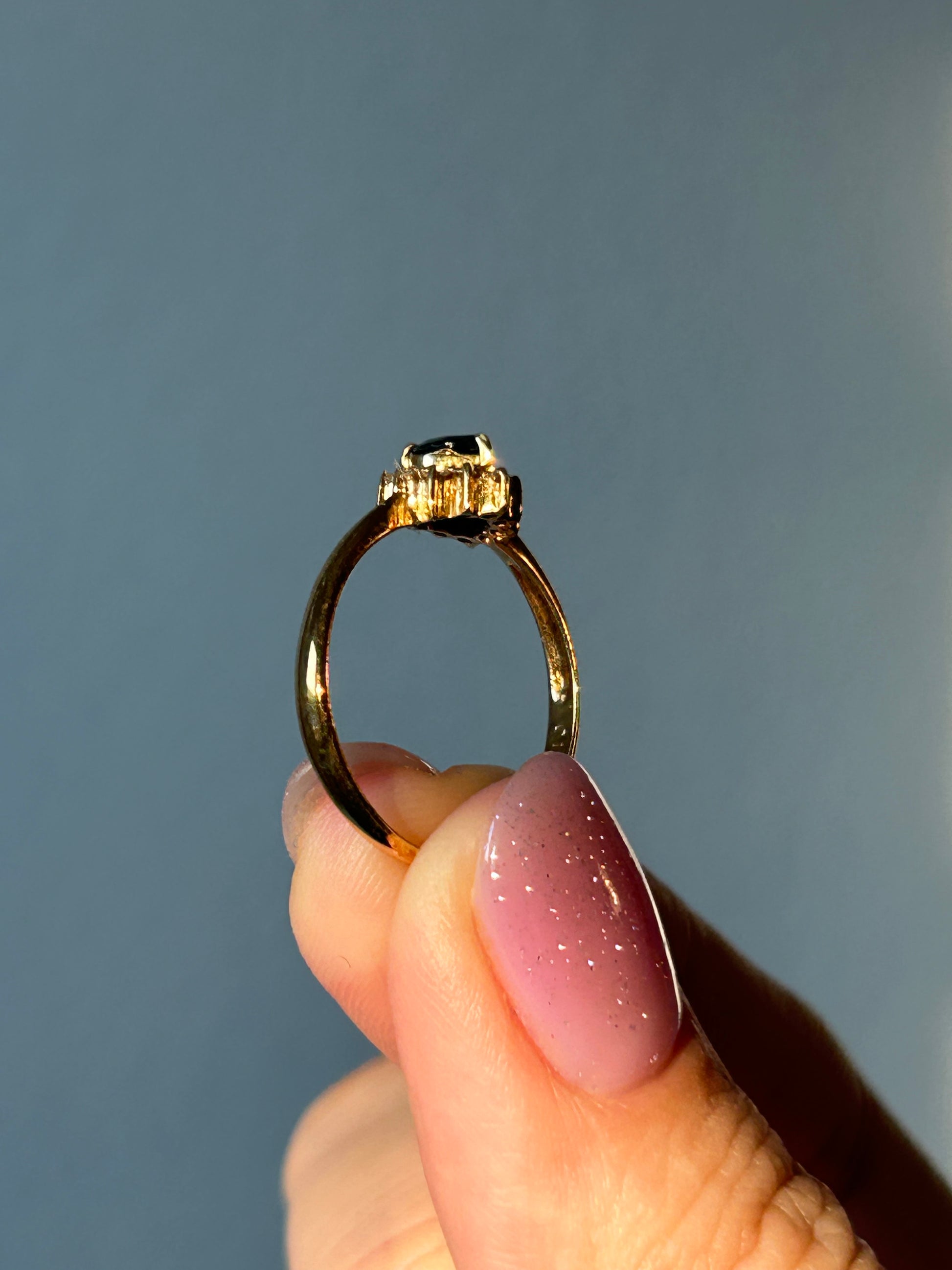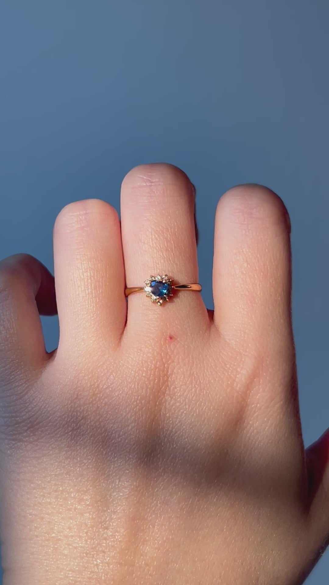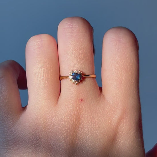 Cute vintage blue heart sapphire ring with a sparkly diamond halo. 18k yellow gold. Size 6. 1.7g