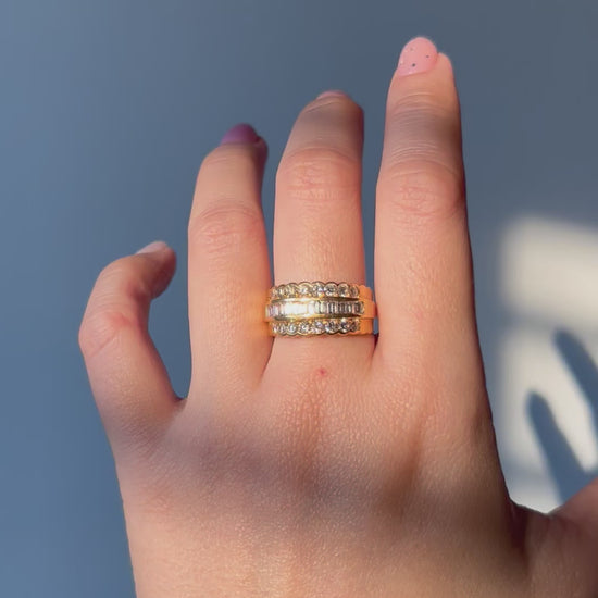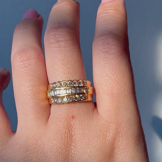 Absolutely stunning vintage diamond ring with a row of baguette cut diamonds surrounded by two rows of round cut diamonds. A showstopper, full of sparkles. 18k yellow gold. Size 7 and resizable. 7.3g. 1.5 carats of natural diamonds.