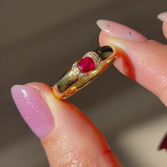18k yellow gold. 0.2 ct ruby. 0.04 ct diamonds. Size 8.25, resizable. 4.1g.