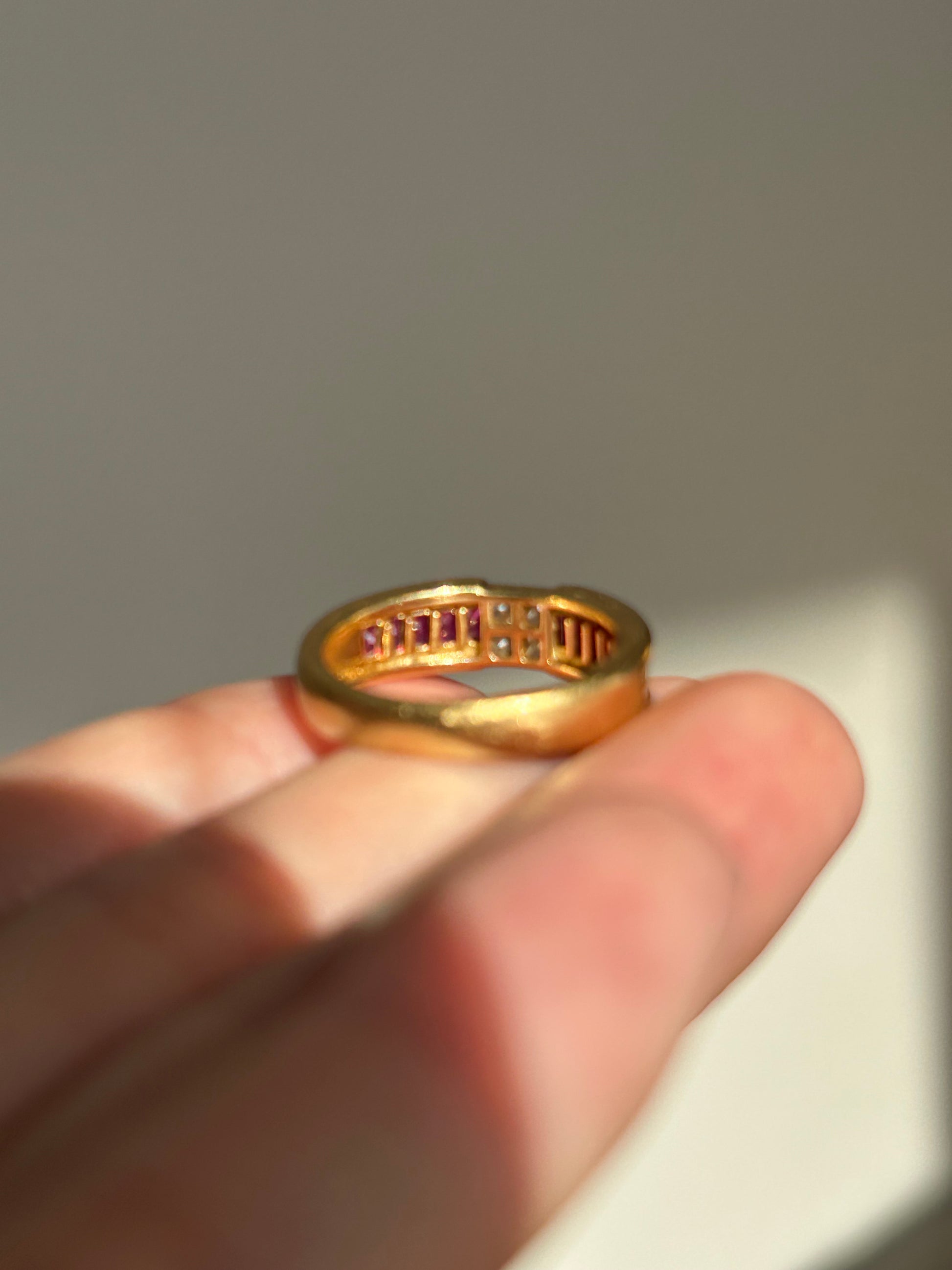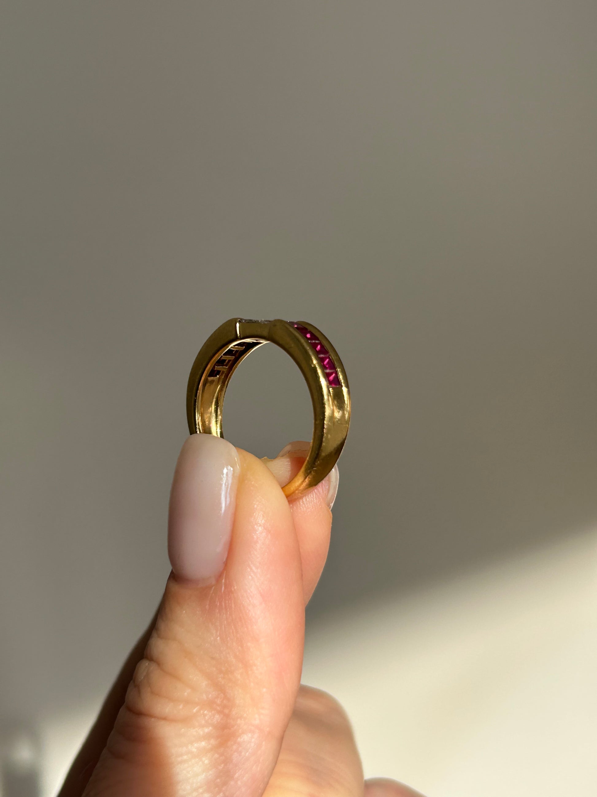 Gorgeous vintage gold ring with four bright white princess cut diamonds in the center and channel set ruby baguettes on the shoulders. Absolutely stunning and so easy to stack.