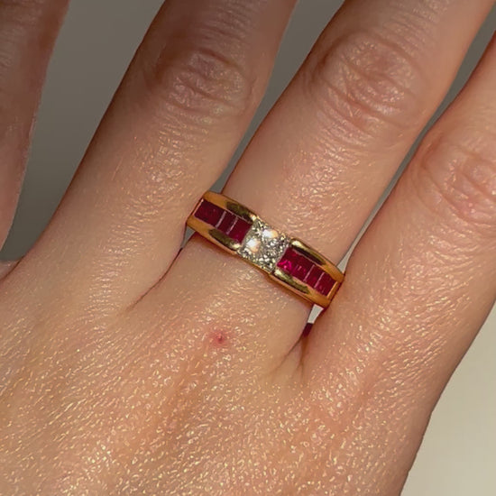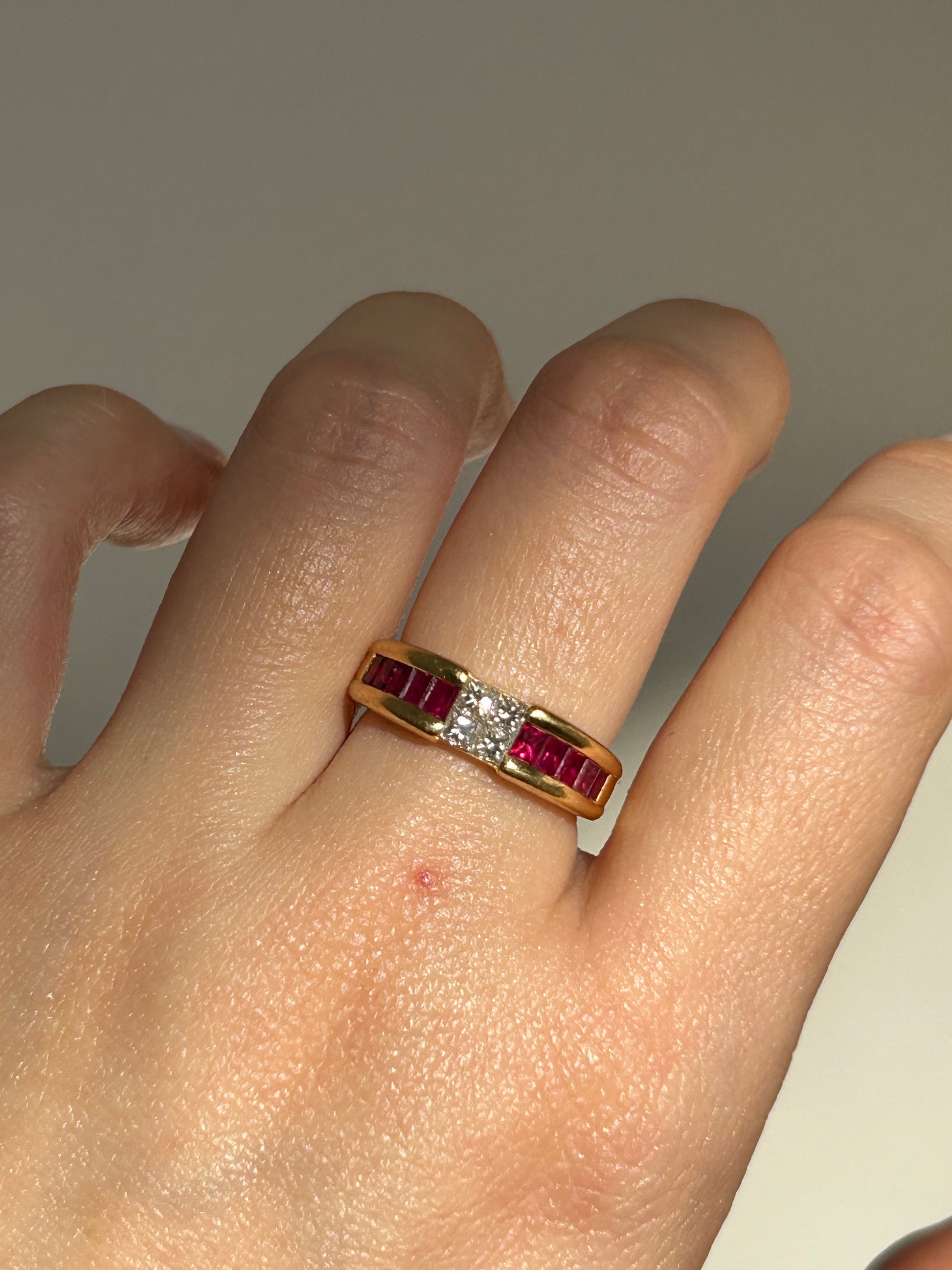Vintage 18k Gold Center Princess Cut Diamond Ring with Channel Set Baguette Rubies