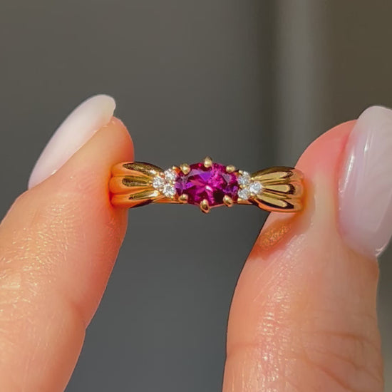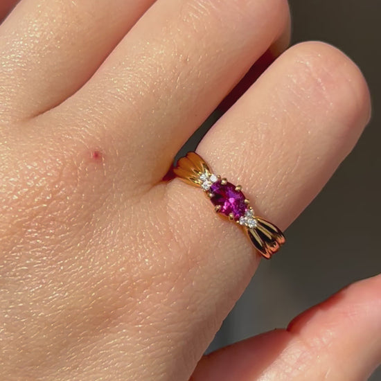 Vintage 18k Gold Rhodolite Garnet Ring with Diamond Accents, by Japanese designer Tasaki