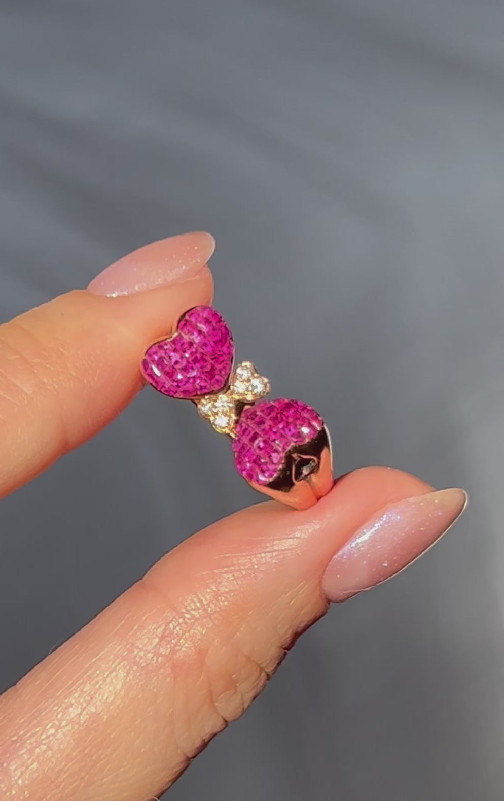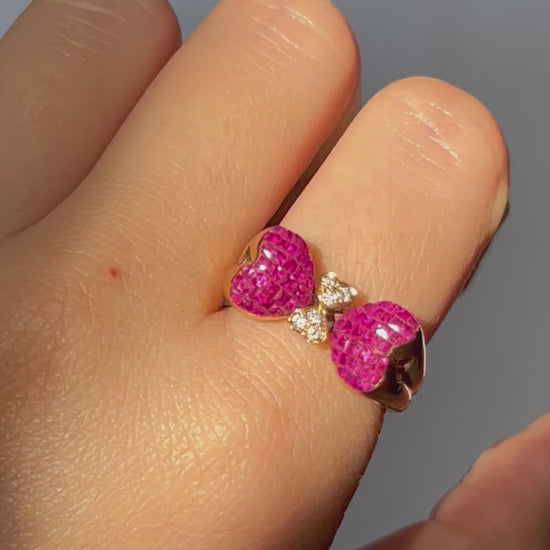 Absolutely gorgeous vintage ring with invisible set ruby hearts as wings and center diamonds as body forming a butterfly shape. This ring is more than just a piece of jewelry. It is a work of art that only a master jeweler can create.