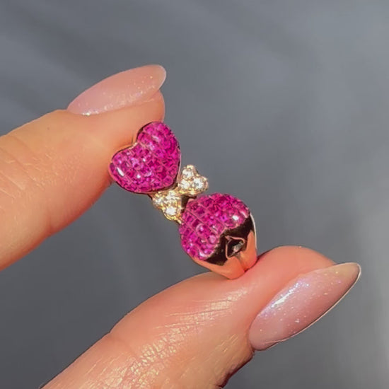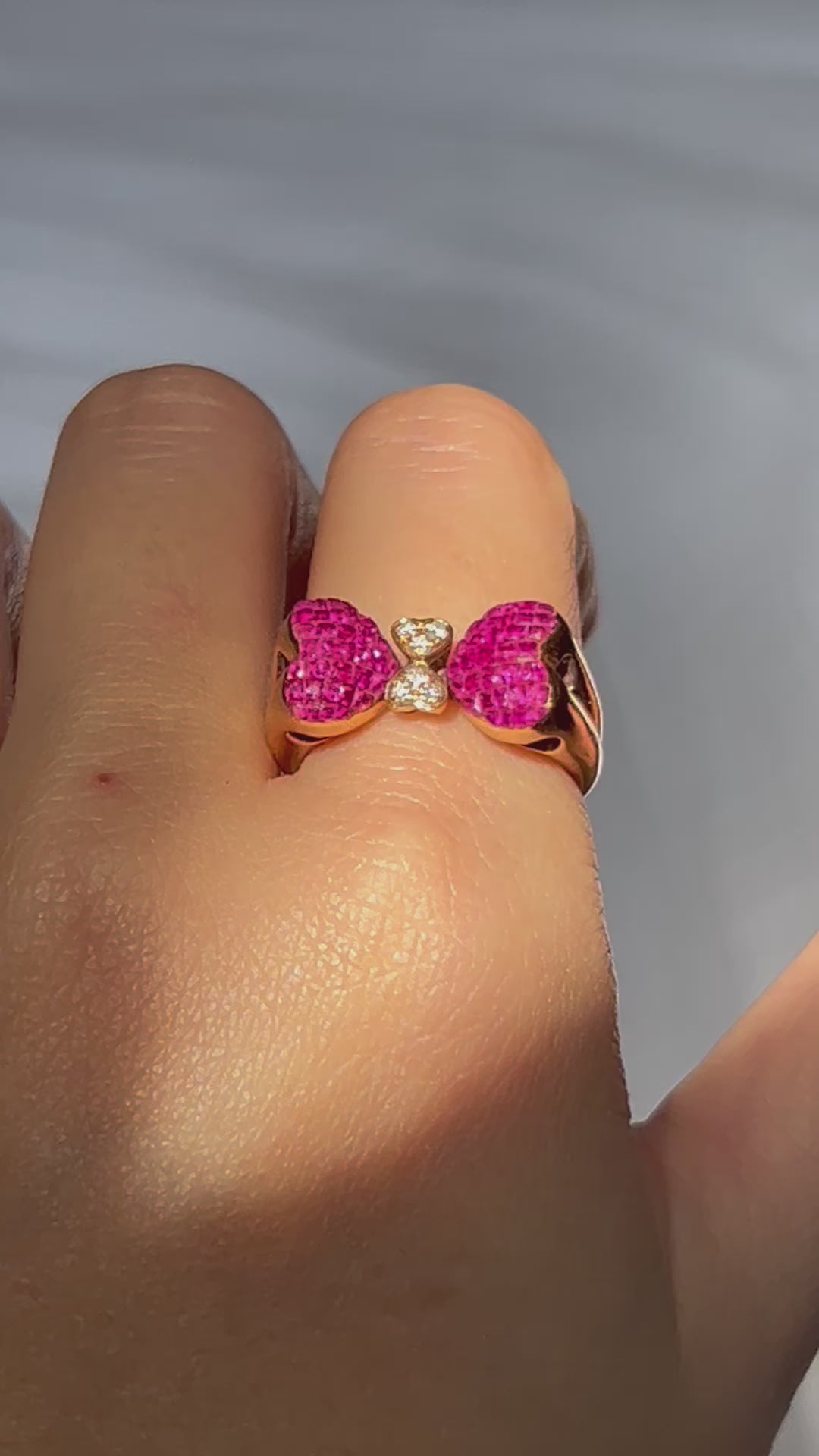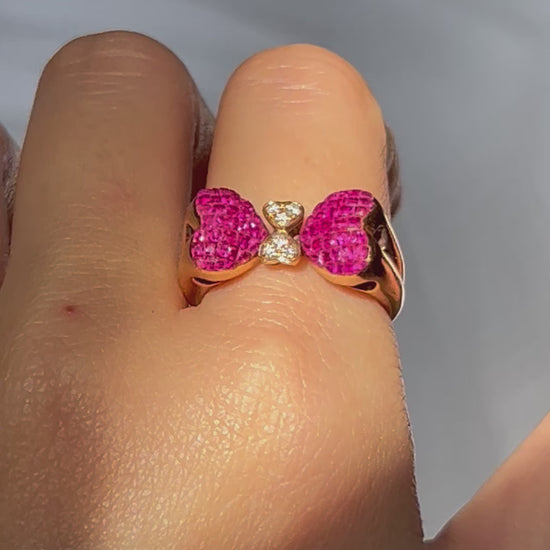 Vintage 18k Invisible Set Ruby Heart-Winged Butterfly Ring: Size 6.75