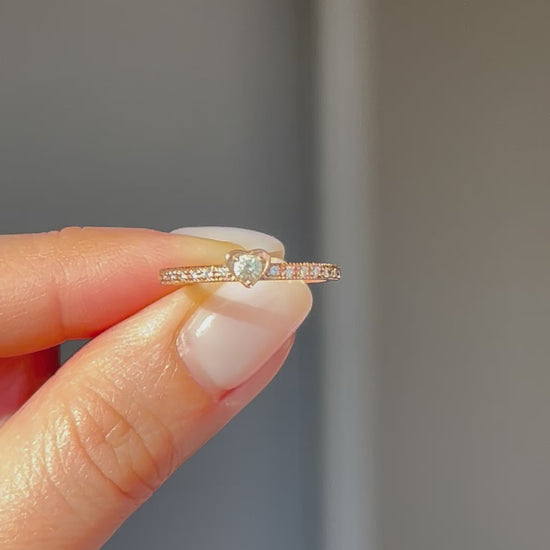 Cute 18k pink gold diamond stacker with a center light yellow diamond in a heart mounting surrounded by tiny pave diamonds on both sides.