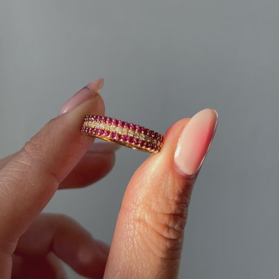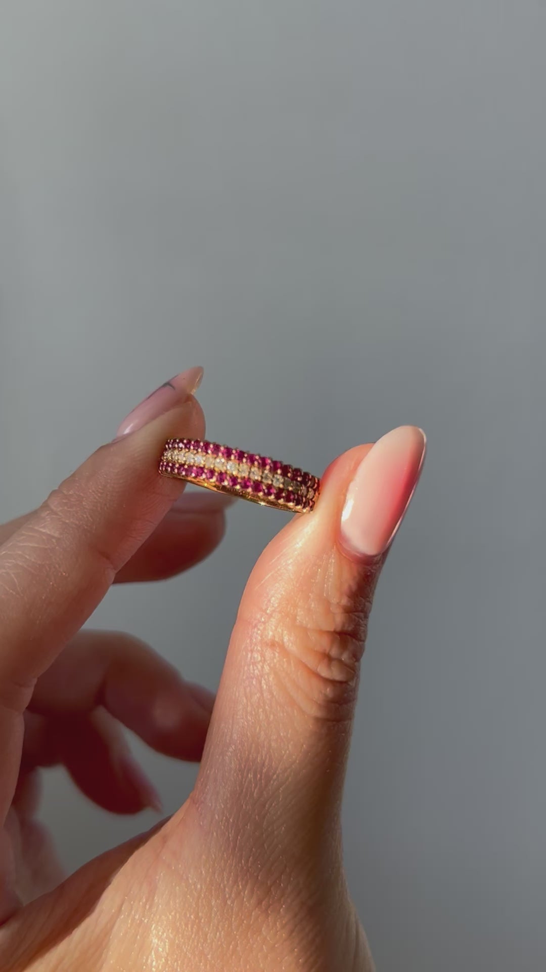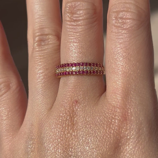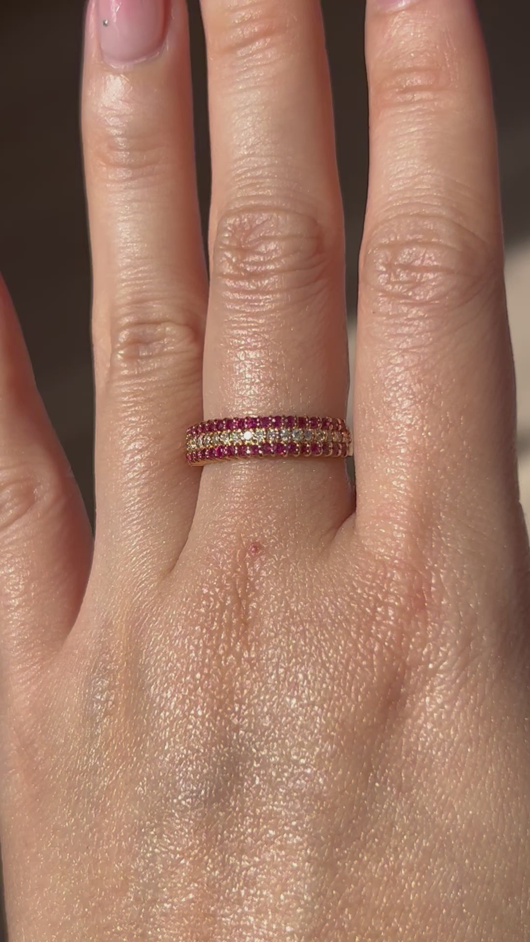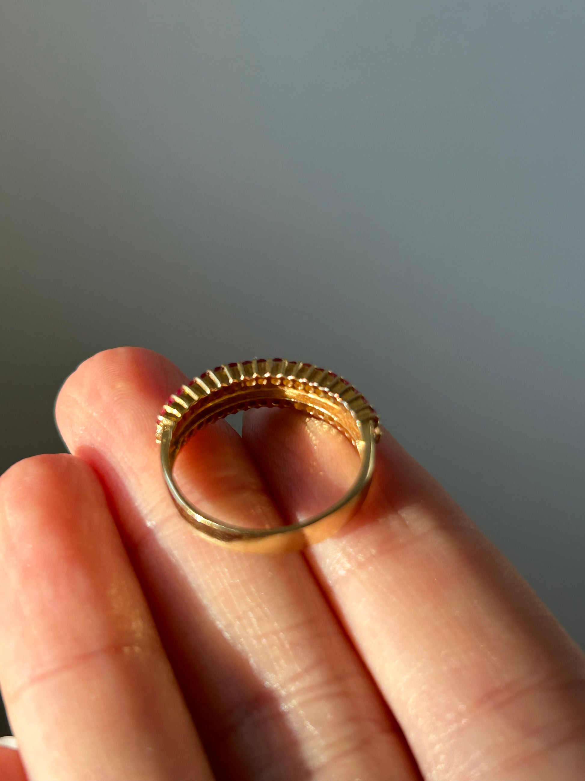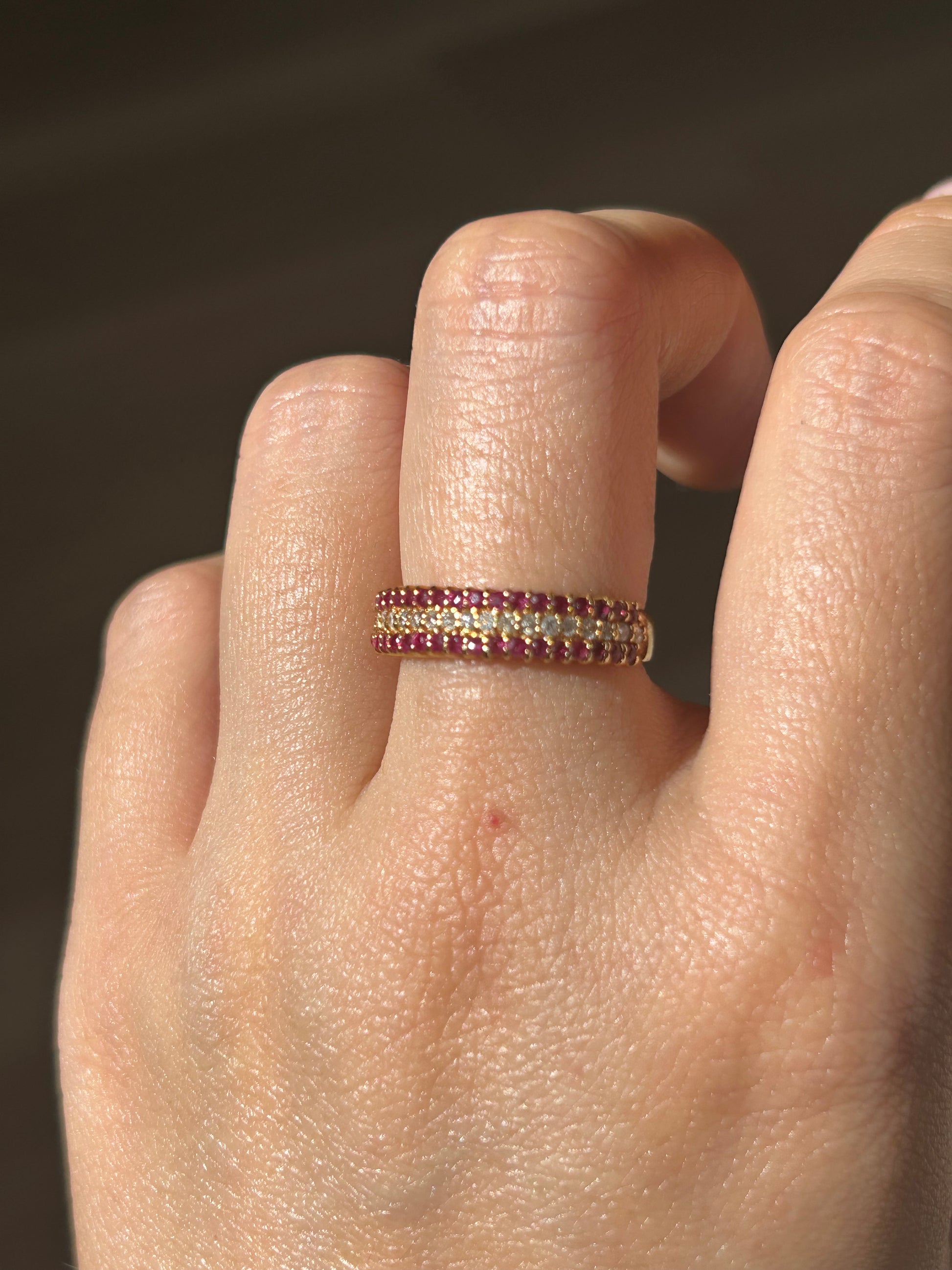 Vintage 18k Triple Row Diamond and Ruby Ring: US Size 5.75
