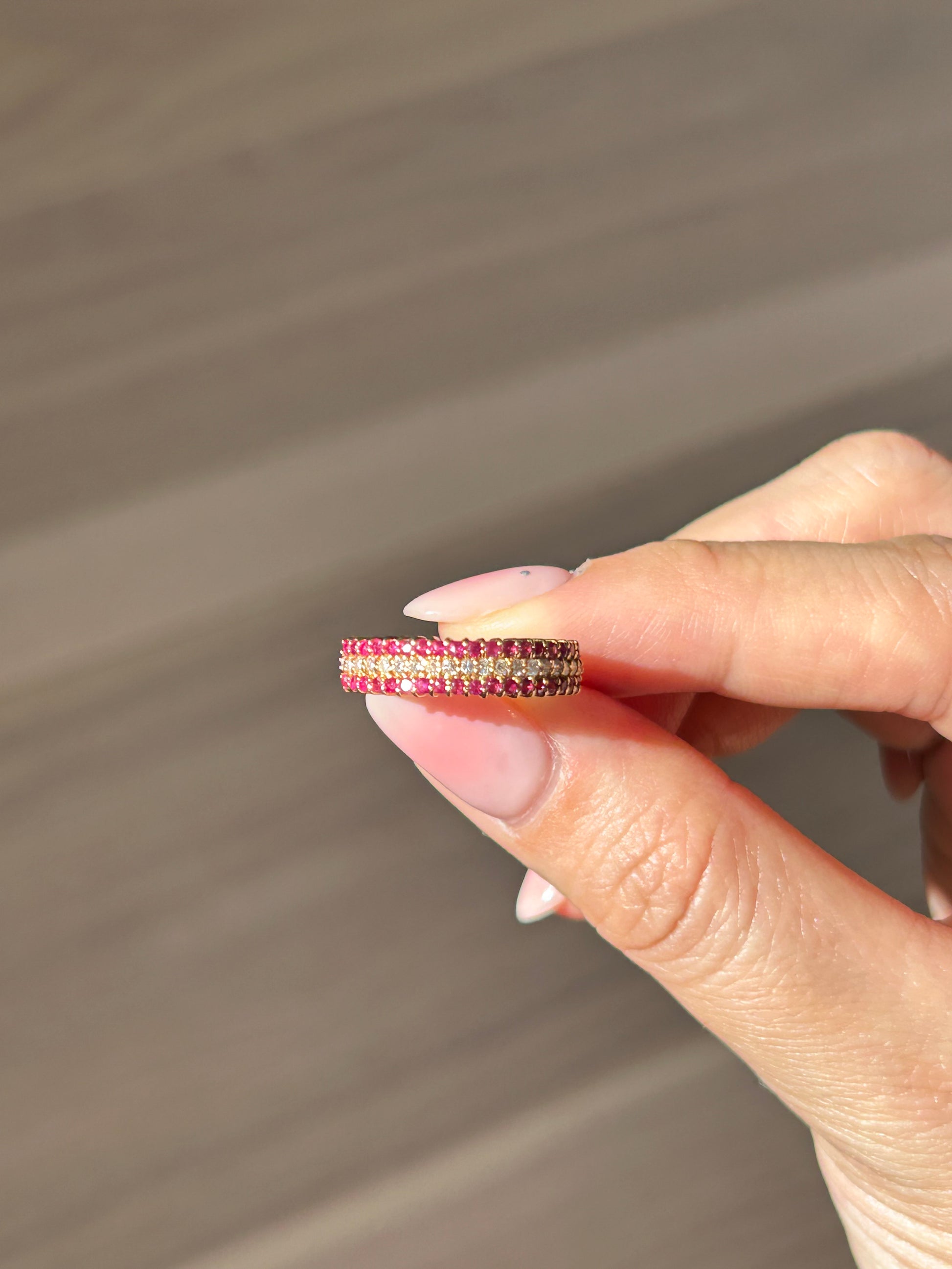 A fun and versatile vintage stacking ring to add to your collection. 18k yellow gold. Size 5.75, sizable. 3.3g. 0.48 ct of rubies. 0.17 ct diamonds.