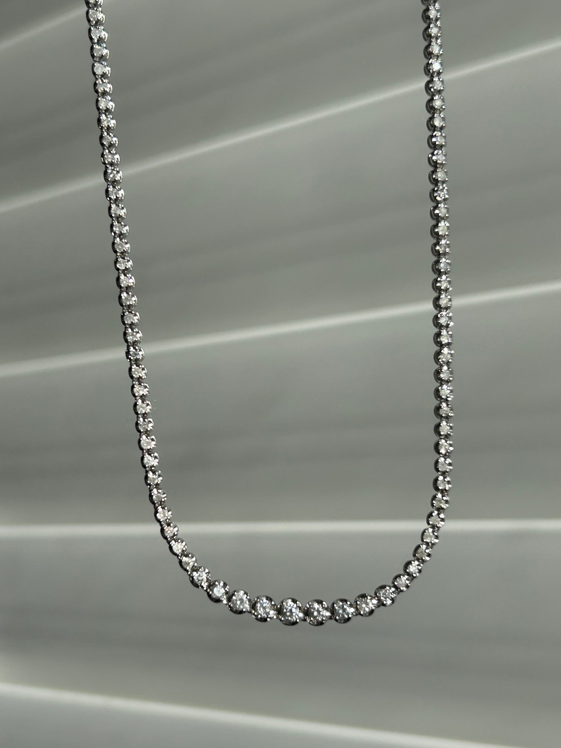 Stunning vintage 18k white gold diamond tennis necklace with 3 ct total of sparkly natural diamonds. The front diamonds are slightly larger than the rest. This necklace is a classic choice for everyday wear while also being the perfect sparkly addition for any special occasions.