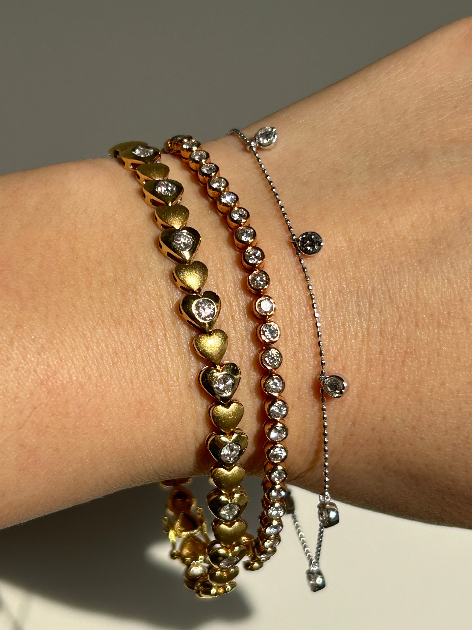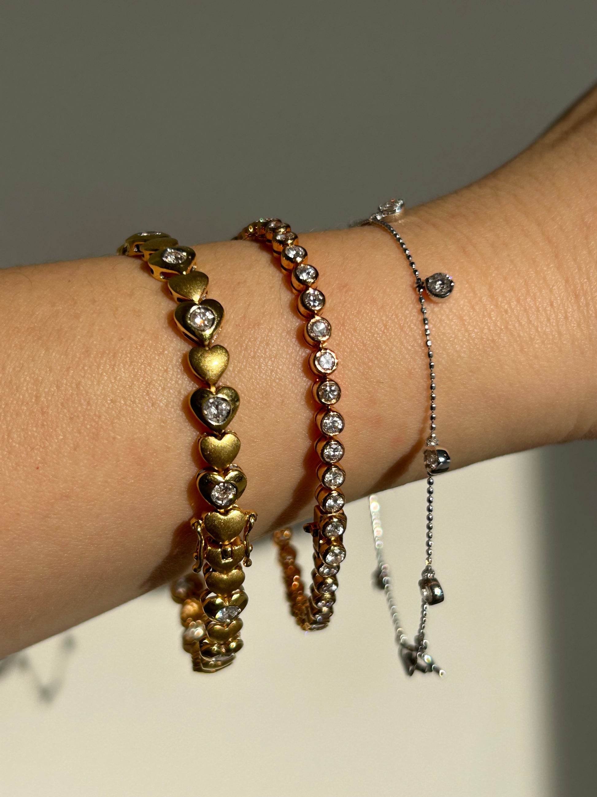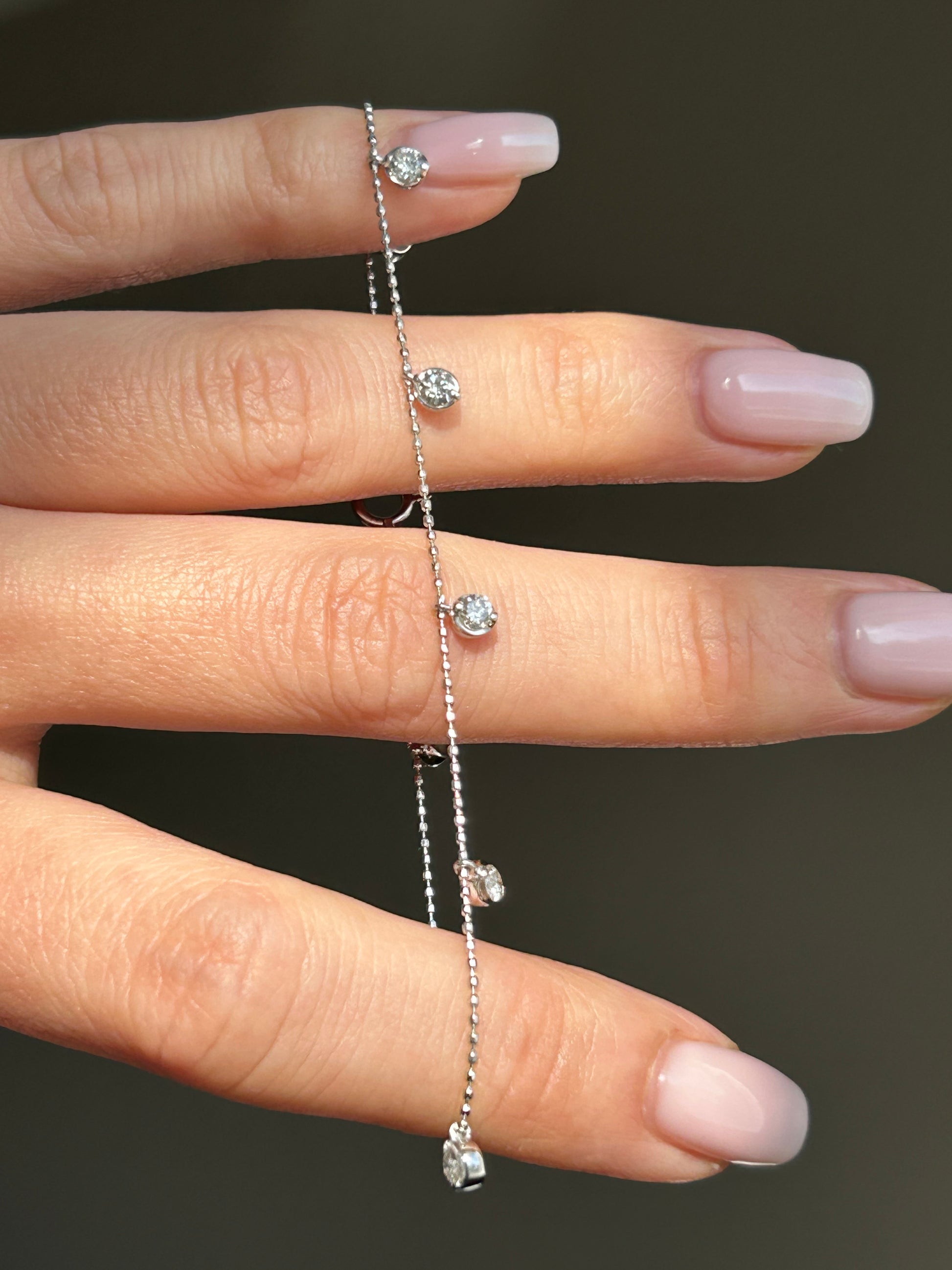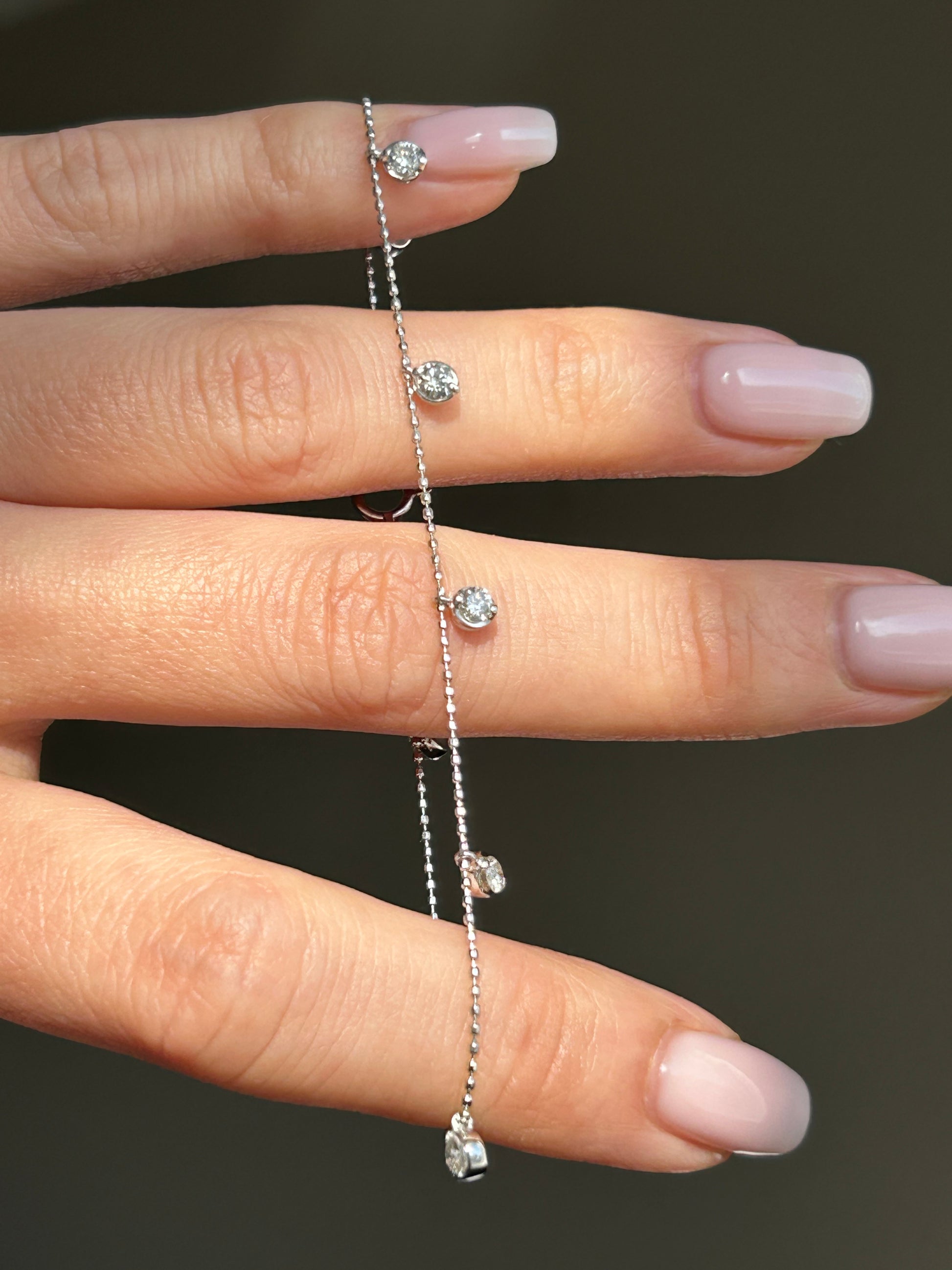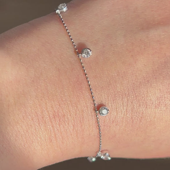 Cute dainty dangling diamond station bracelet. Perfect pop of sparkles for your stack. 18k white gold. 7.25” in length. 2.2g. There are 8 diamonds, each ~2.8 mm in diameter (~0.08 ct).