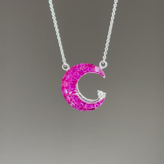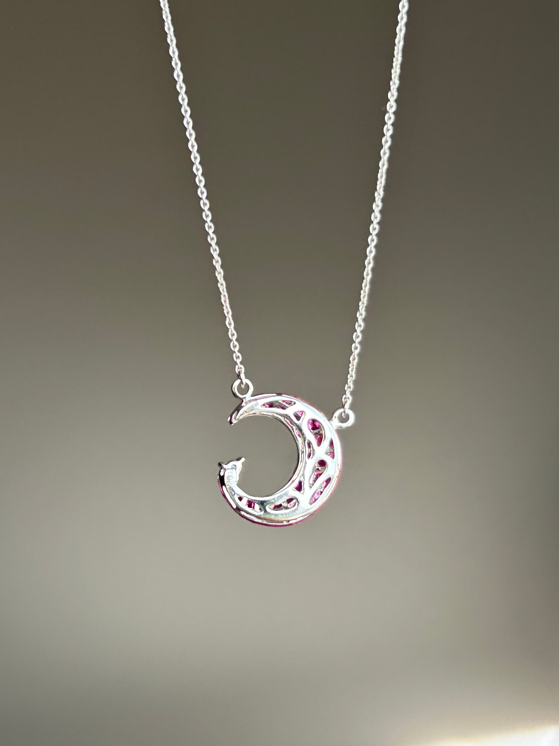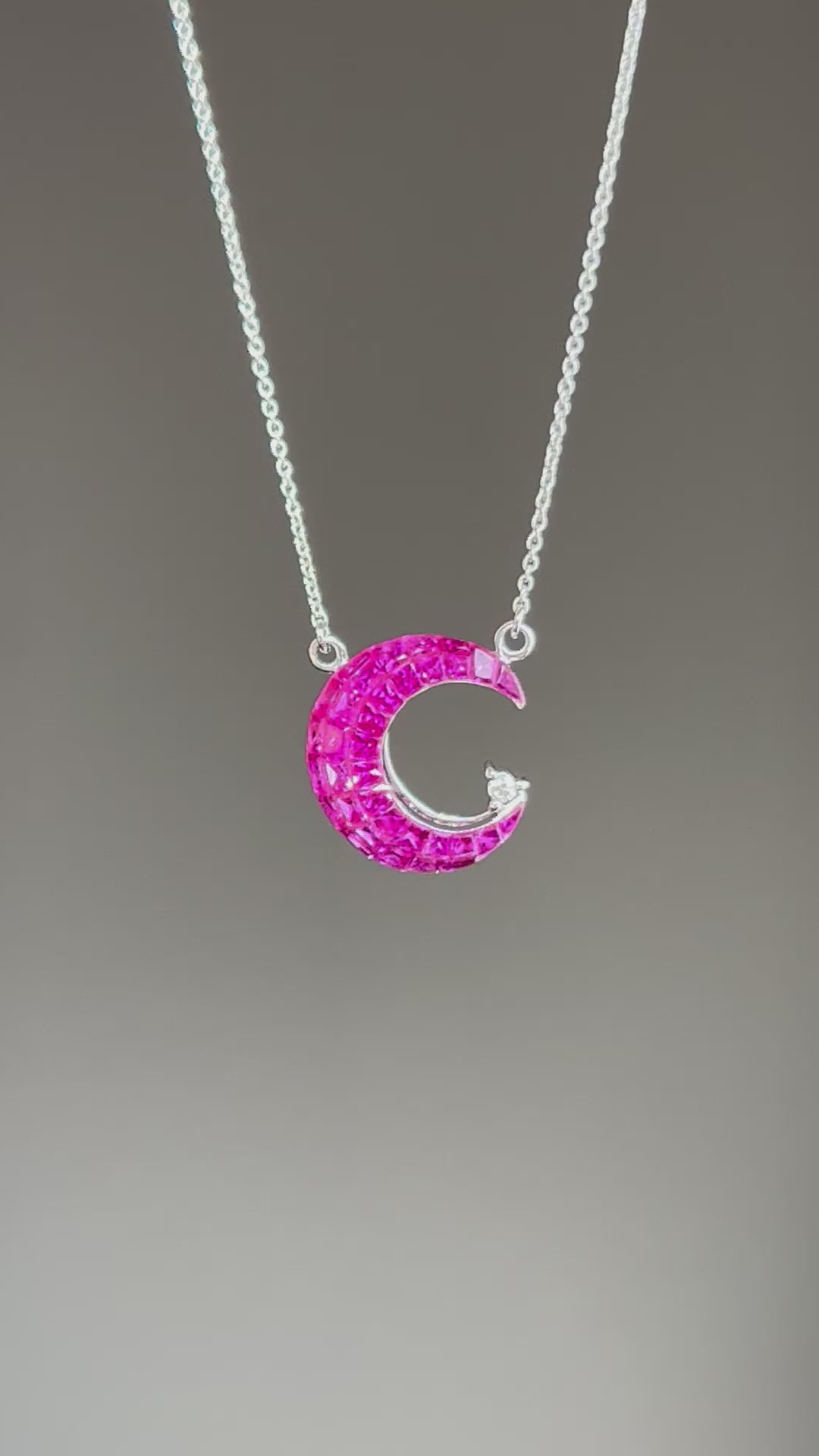 Gorgeous crescent moon pendant chain with skillfully invisible set rubies and a dainty accent diamond. Perfect pop of color for your stack.