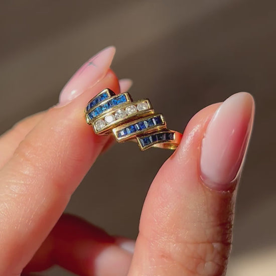 Vintage Art Deco Inspired 18k Gold Diamond & Sapphire Ring - Geometric Zig Zag Design